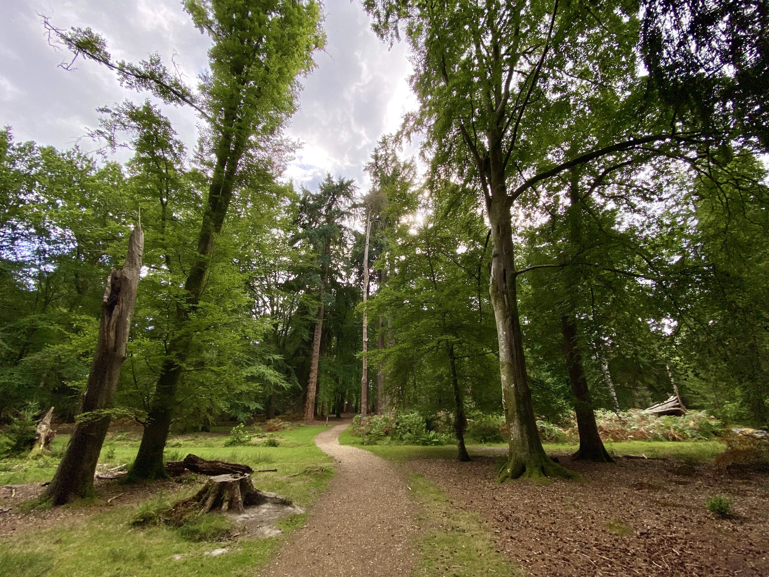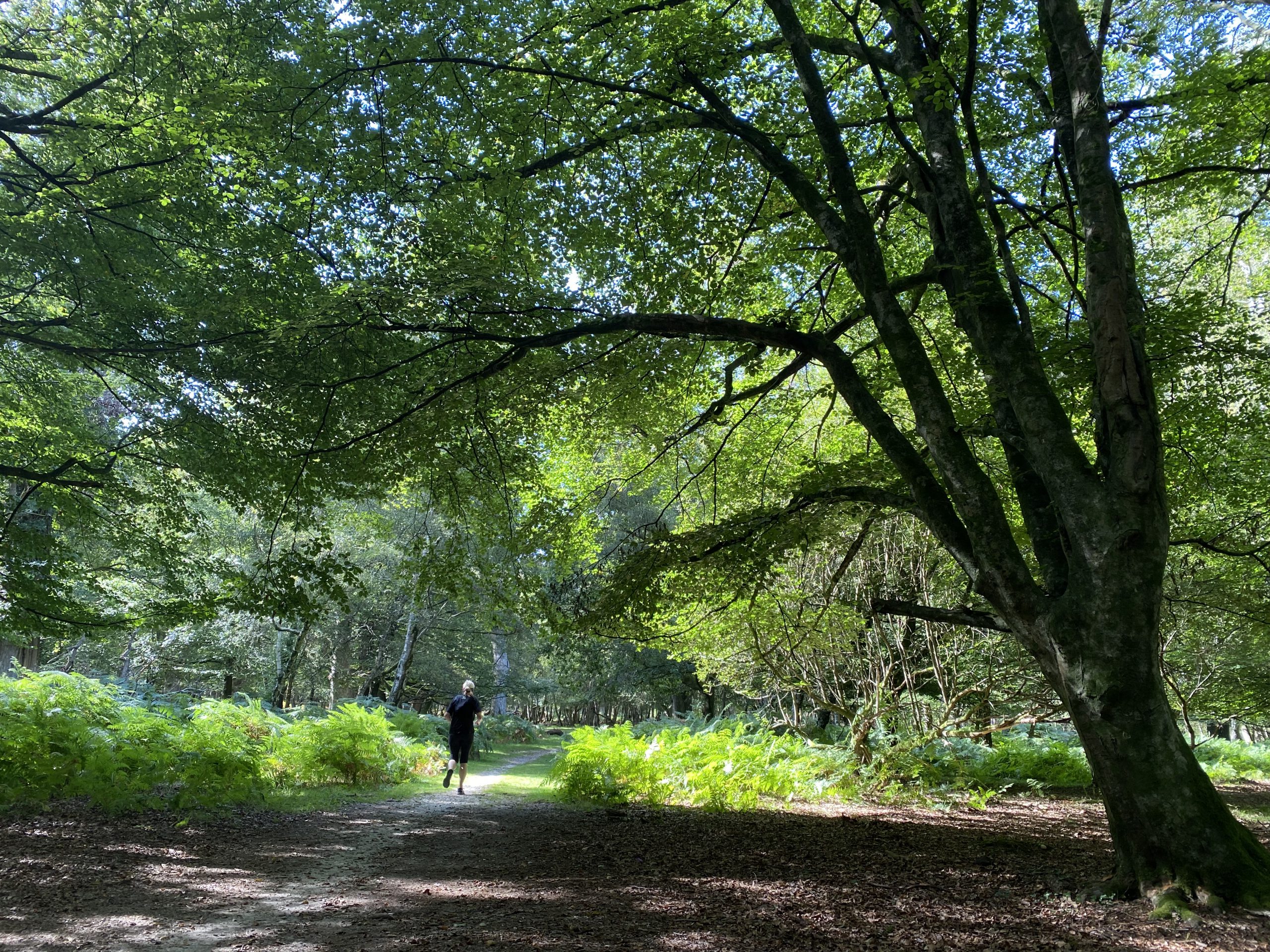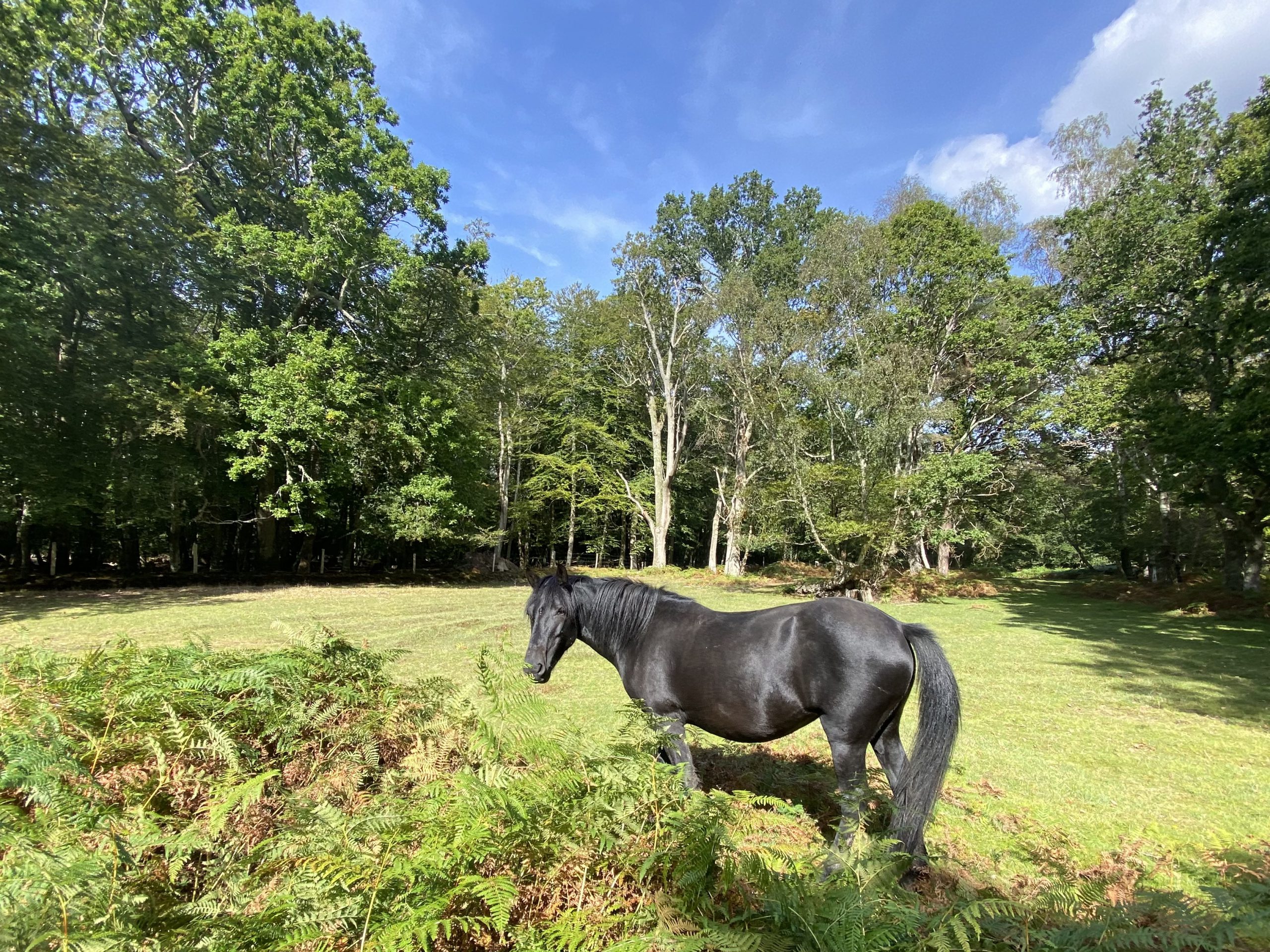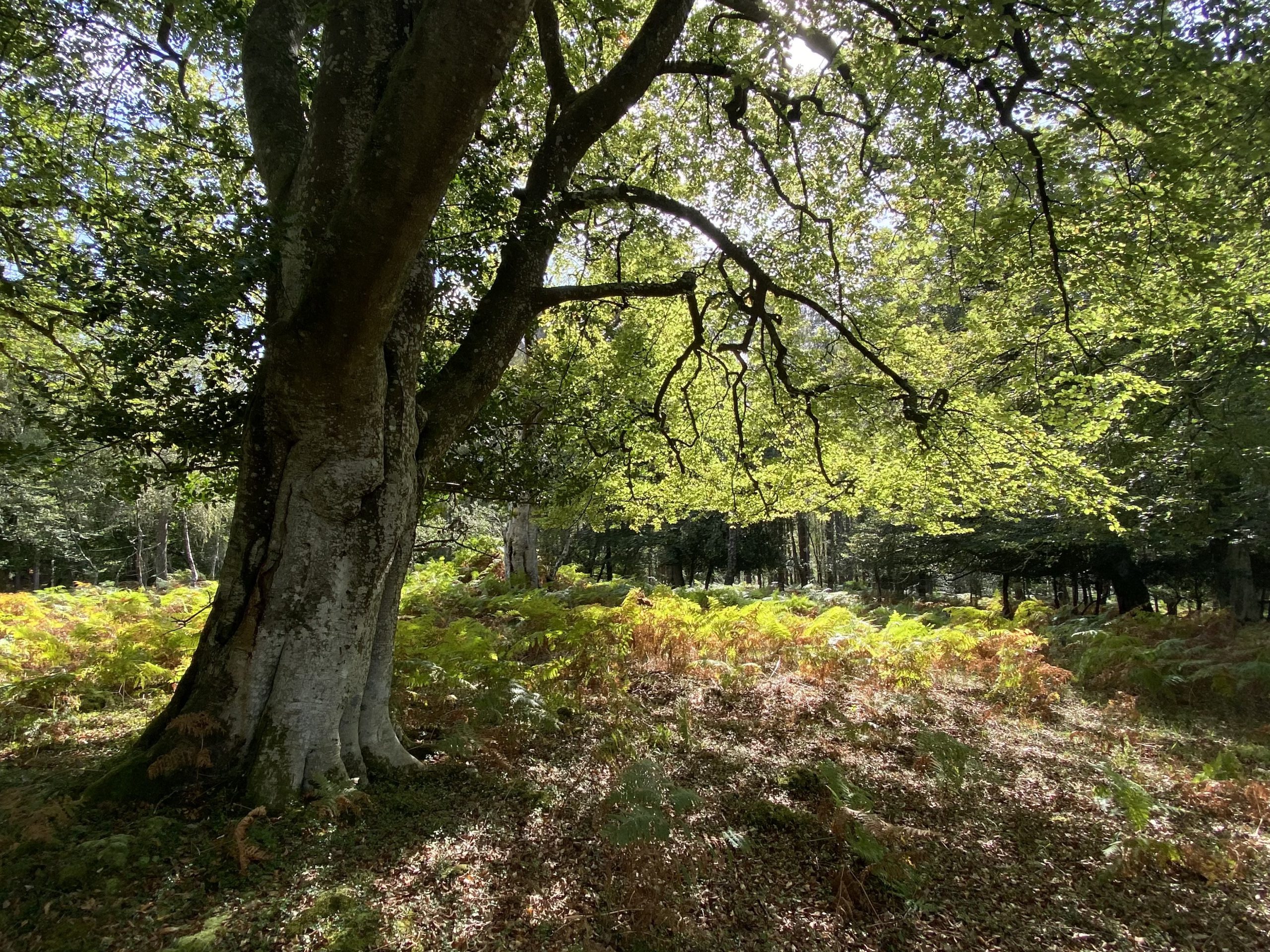 After sticking to the cycle track for a few miles we cut into the forest on a grassy footpath. The New Forest has an unusual mix of flora with open expanses of grass and heathers interspersed with woodland dominated by Beech and Oak trees. On the fringes of the forest ferns dominate the undergrowth and, whiles these are all familiar sights in the UK, somehow their arrangement in the New Forest makes it unique.