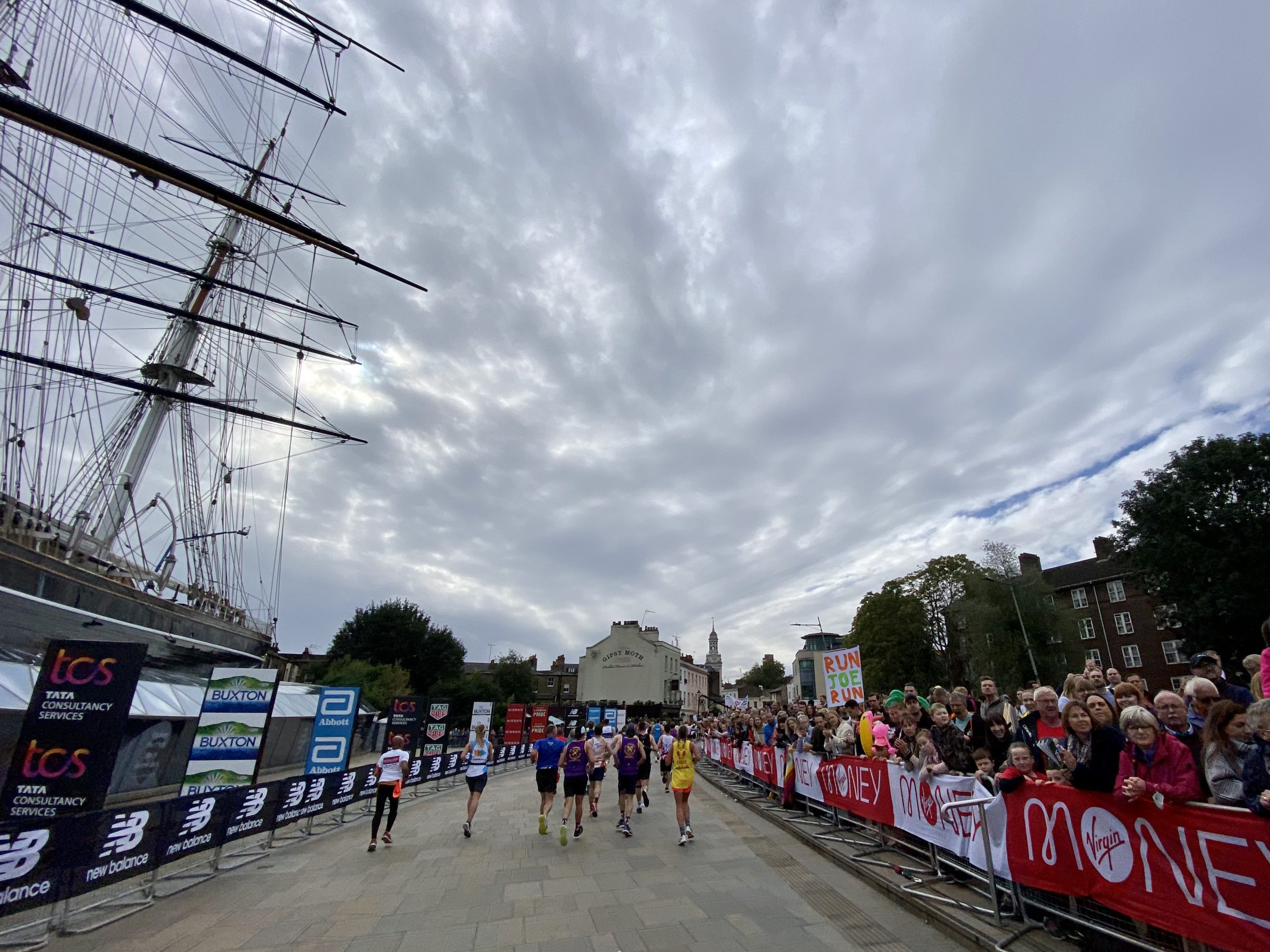 Entering Greenwich town sees the volume go up several levels – it’s one of the most amazing sections of the run. Banking around the Cutty Sark at around 6.5 miles is one the real iconic moments in the day. Still feeling strong, onwards…