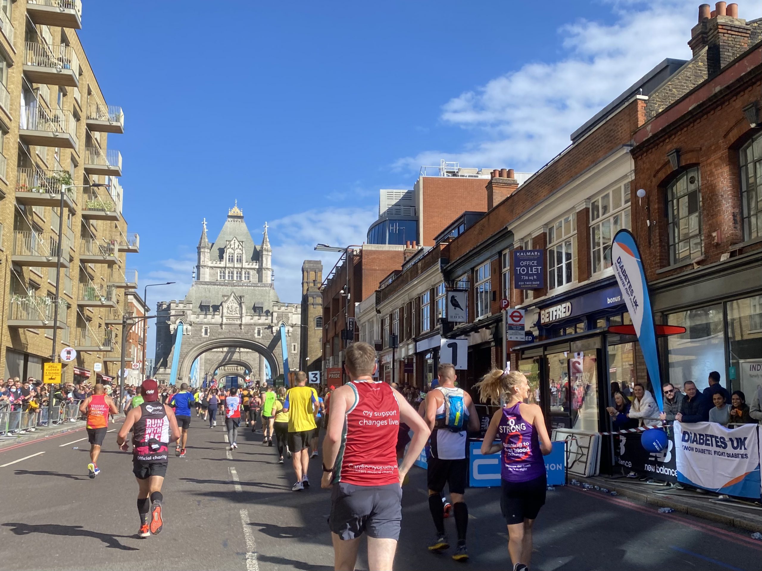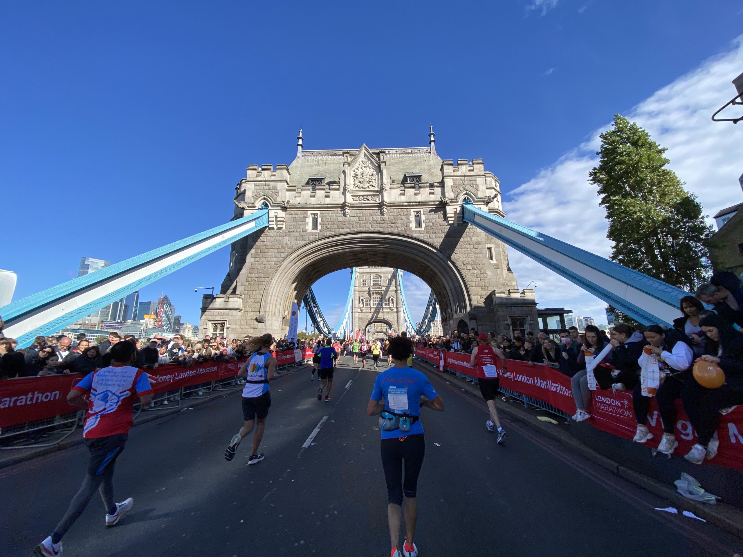 The next key moment is arriving at Tower Bridge. It just sort of pops-up on you as you round a bend and signifies the rough halfway mark. Shortly after crossing over comes the true half way and I saw my time was about 1:48, wow, this was looking good! I’d run the Cheltenham half in 1:46. Maybe it was a bit too good?