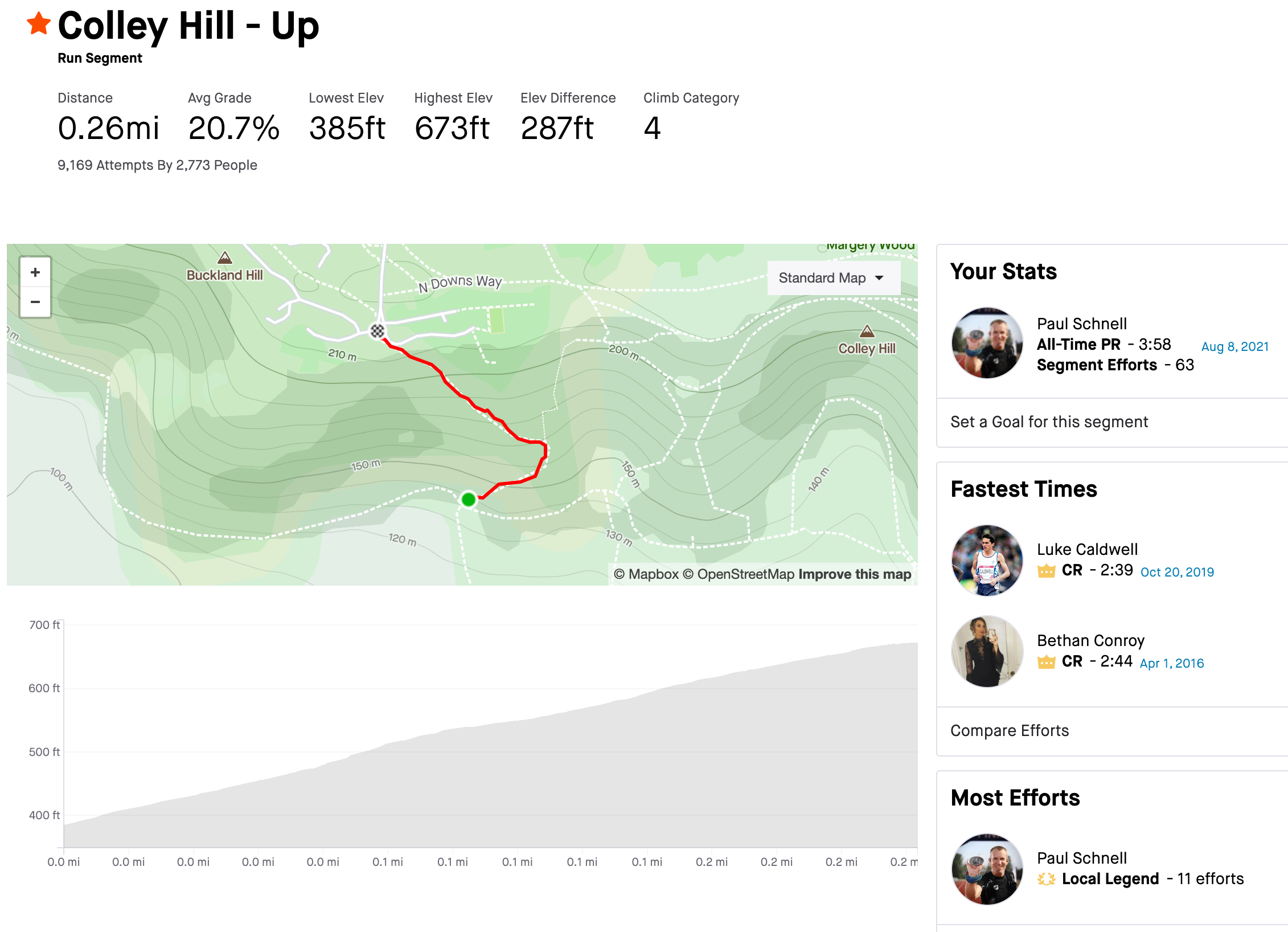 Strava has a feature which allocates “local legend” status to the person who has completed a segment the most times in the previous 90 days. While my PR of 3:58 is a long way off the men’s record of 2:39, I try and maintain this one as ‘my’ segment in terms of getting it done.