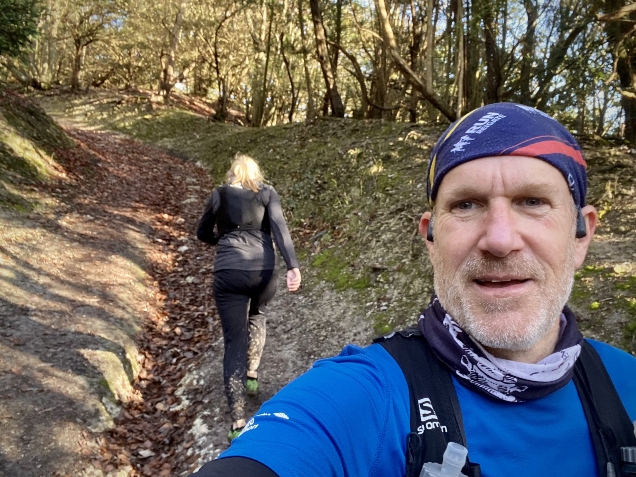 The real work started as we made our way onto the North Downs Way(NDW). This route has been a wonderful part of our running for the past few years and, given that our first outing was a very tough out-and-back on the NDW to Box Hill, it seemed appropriate to get it into our final run. This section was slightly delayed by a detour to “The Bench”. Dan (another mate from my running club and of course Dan’s Beer Run) had spotted the earlier post and sent a pic of his morning run via The Bench, we just had to make a detour.